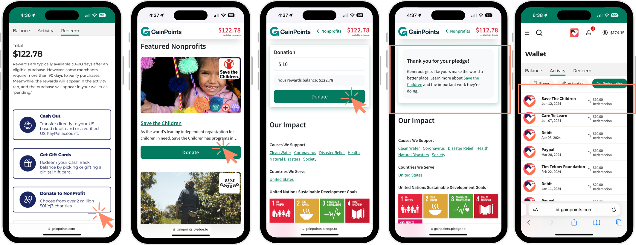 Section titled “Redemption + Flow of Funds”To redeem points, the rewards platform converts the points to a dollar amount, and makes an API call to the Pledge Donate API. Pledge tracks this donation as pending. On a periodic basis, we will batch up all of the pending donations and charge them to a payment method provided to us in a single transaction. It can either be via credit card or ACH. The rewards platform can configure (via the Impact Hub dashboard) these transactions to happen monthly, or more frequently, based on when certain donation thresholds are met. At a minimum, you should be charged monthly so that the donations don’t take too long to reach the nonprofit.